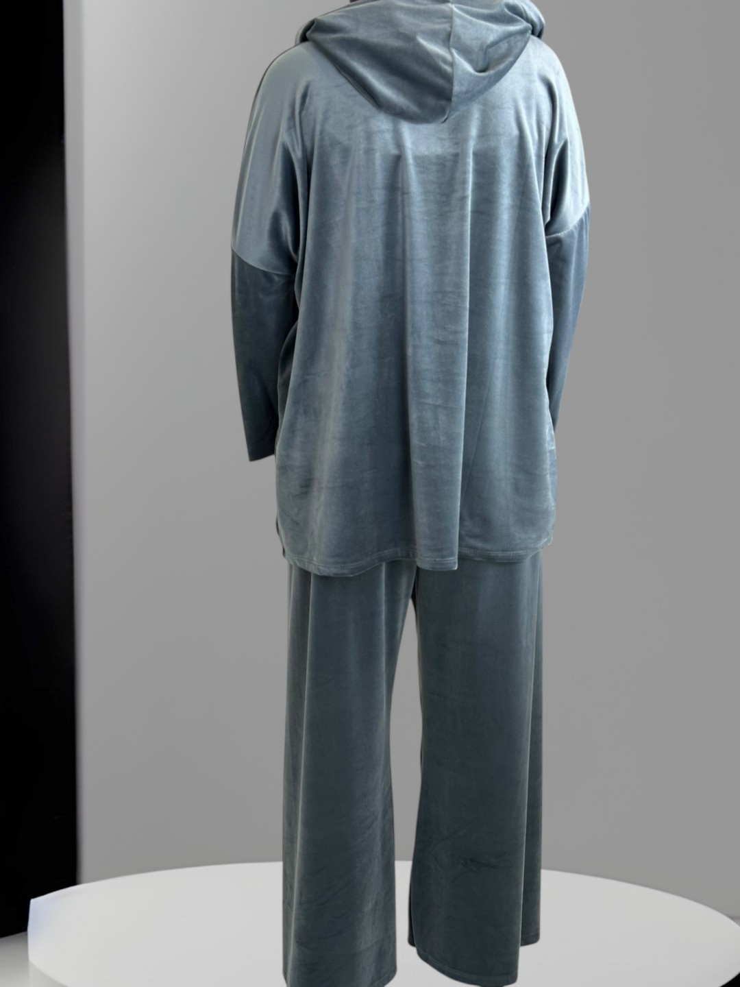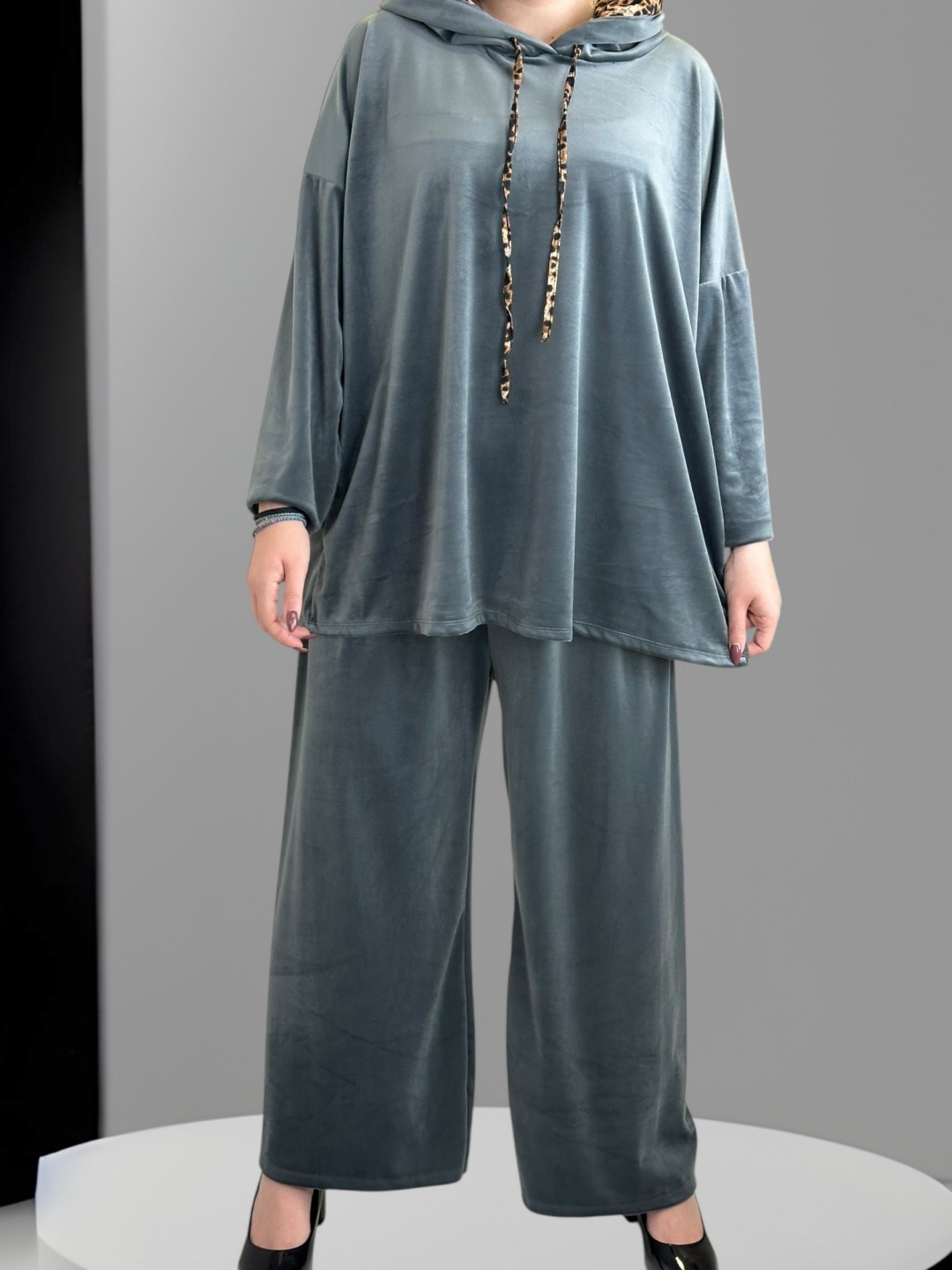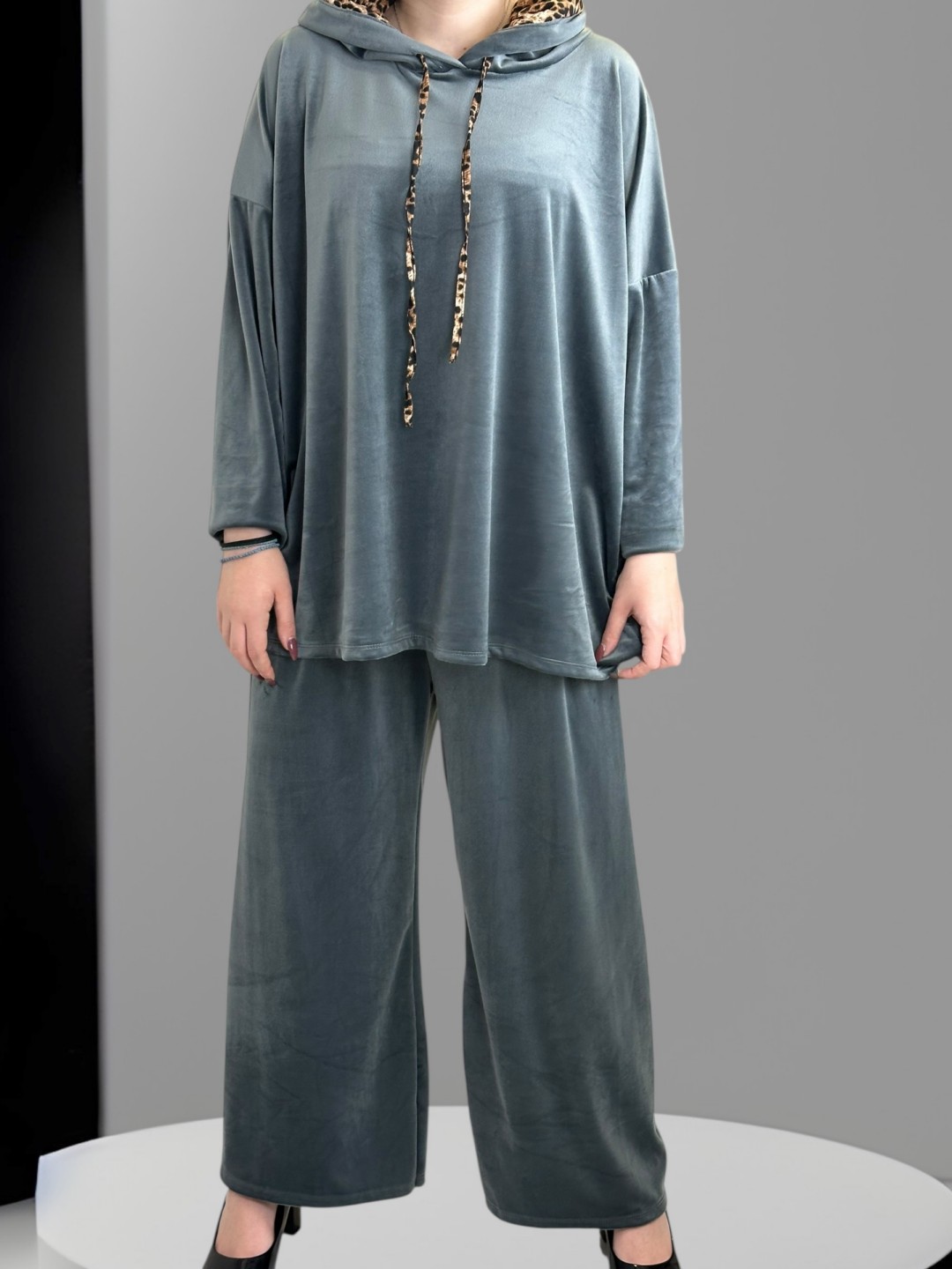 Πολυτελές σετ βελούδινο plus size, με λεπτομέρειες λεοπάρ που τραβούν την προσοχή. Έχει σύνθεση 95% πολυεστέρα και 5% ελαστάν για άνεση και εφαρμογή. Διαθέσιμο σε One size.
