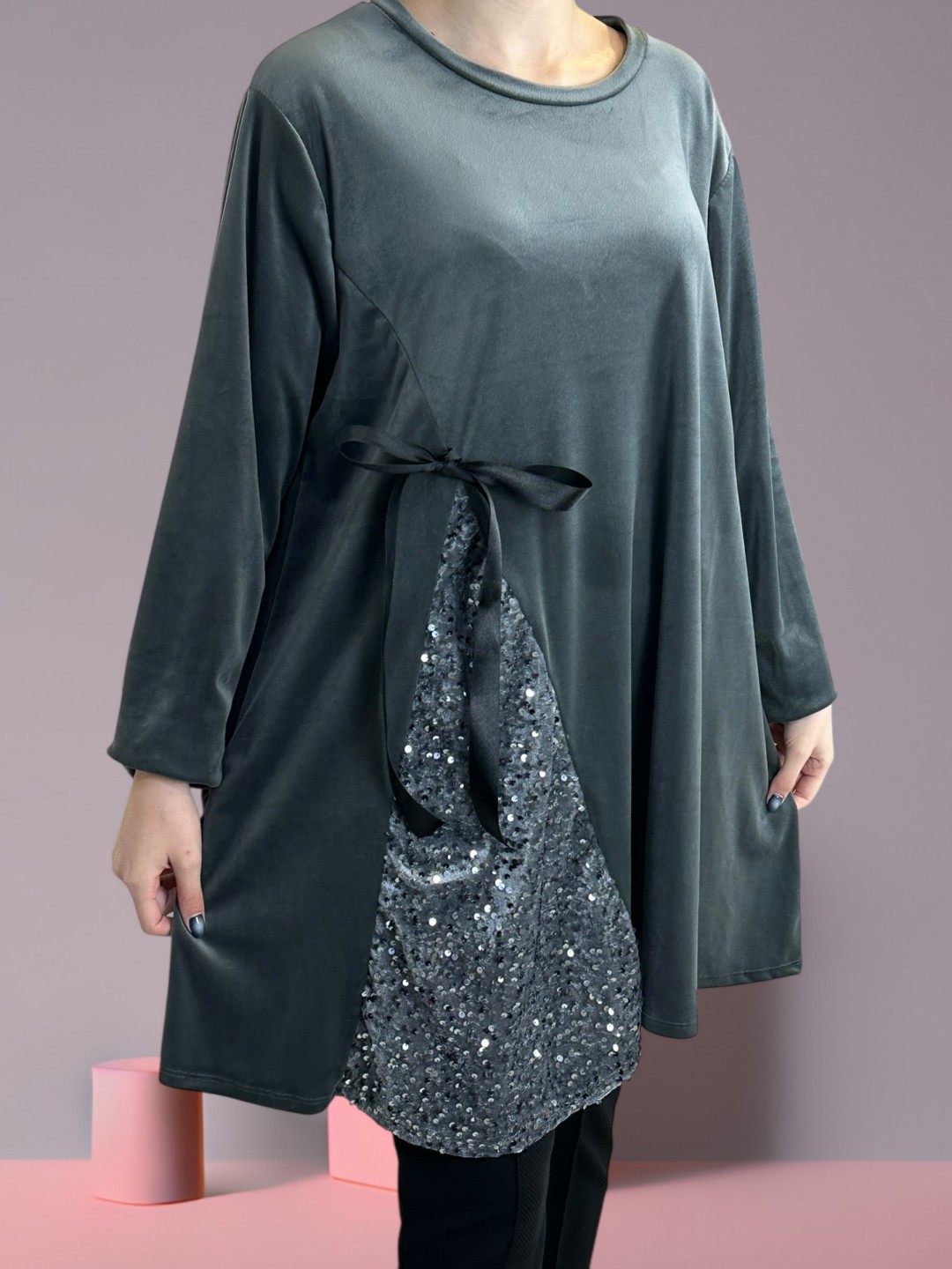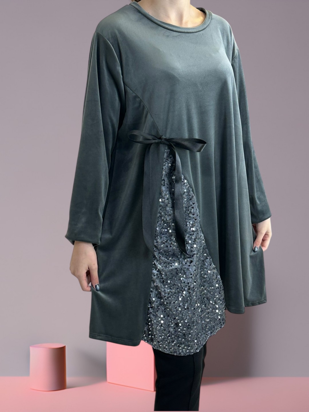 Απόκτησε το plus size Velvet Lurex μπλουζοφόρεμα με πλαϊνή κορδέλα. Συνδυασμός απαλότητας και ελαστικότητας με 5% elastan, 60% viscoza, 35% poliester. One size για όλες τις σιλουέτες.